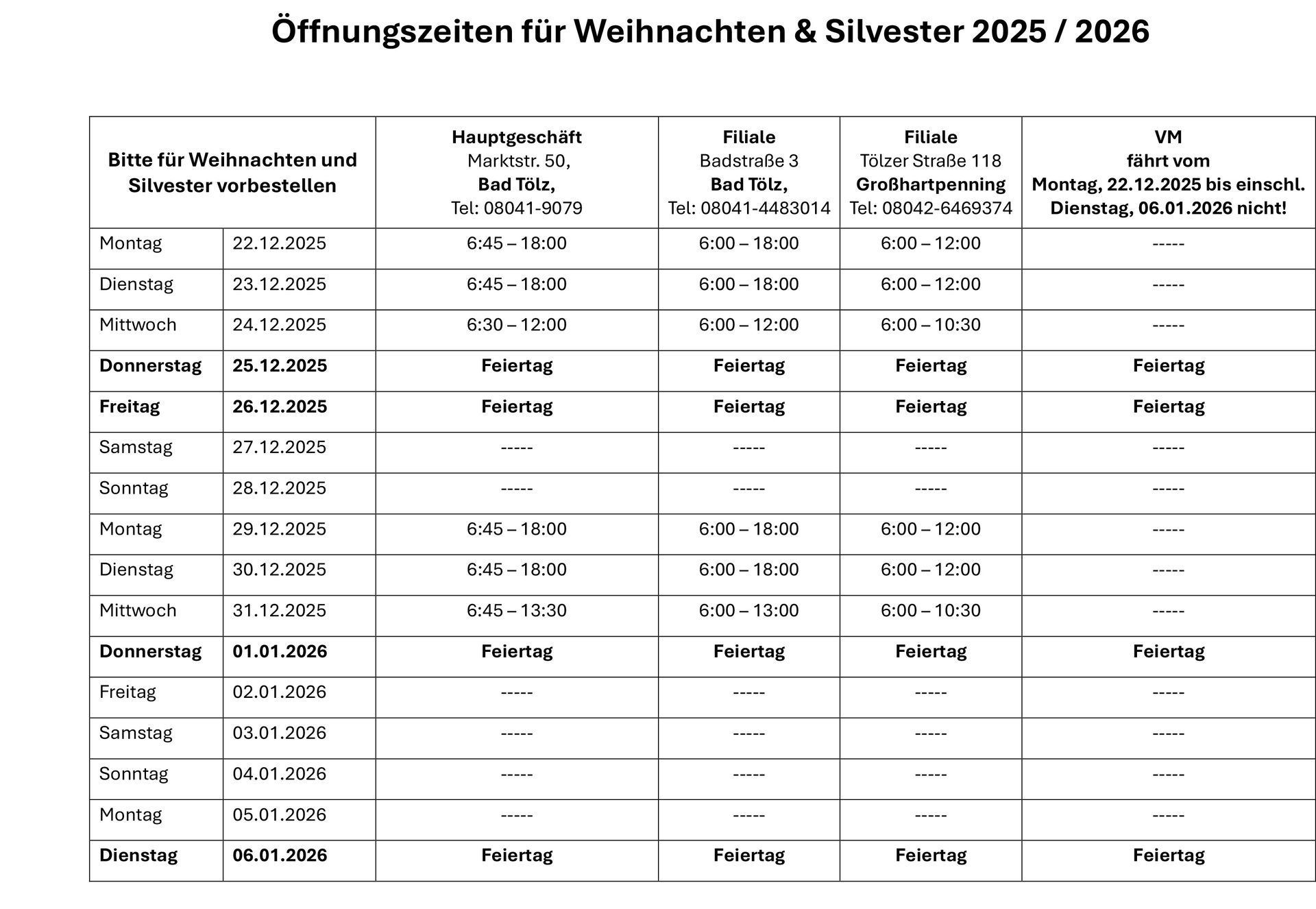 Unser Hauptgeschäft und Filialen sind an den gesetzl. und kirchl. Feiertagen nicht geöffnet.